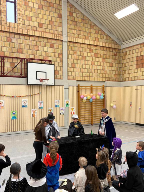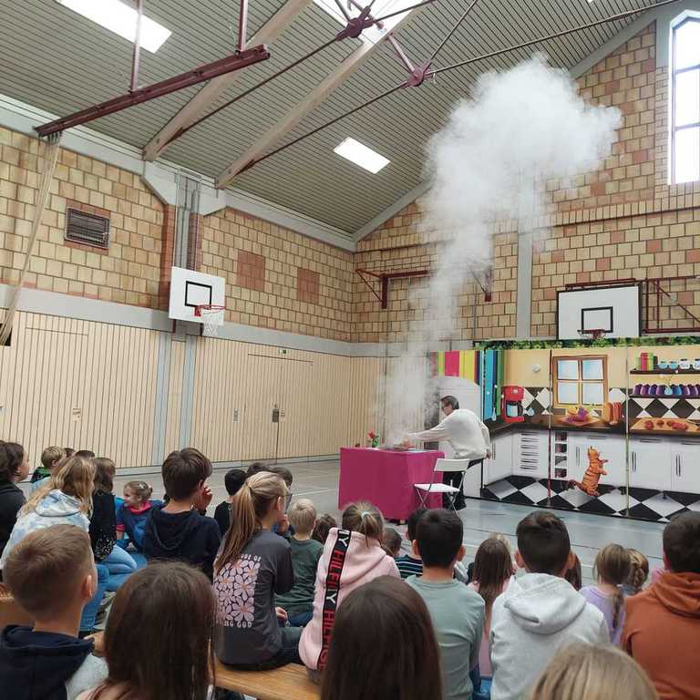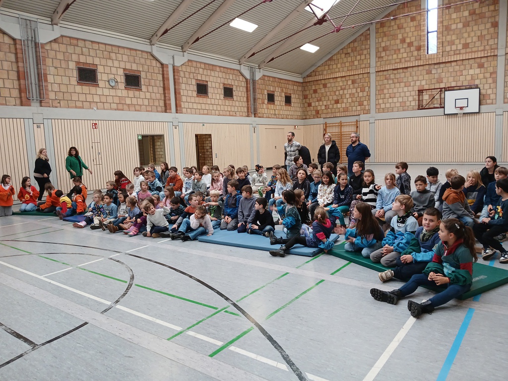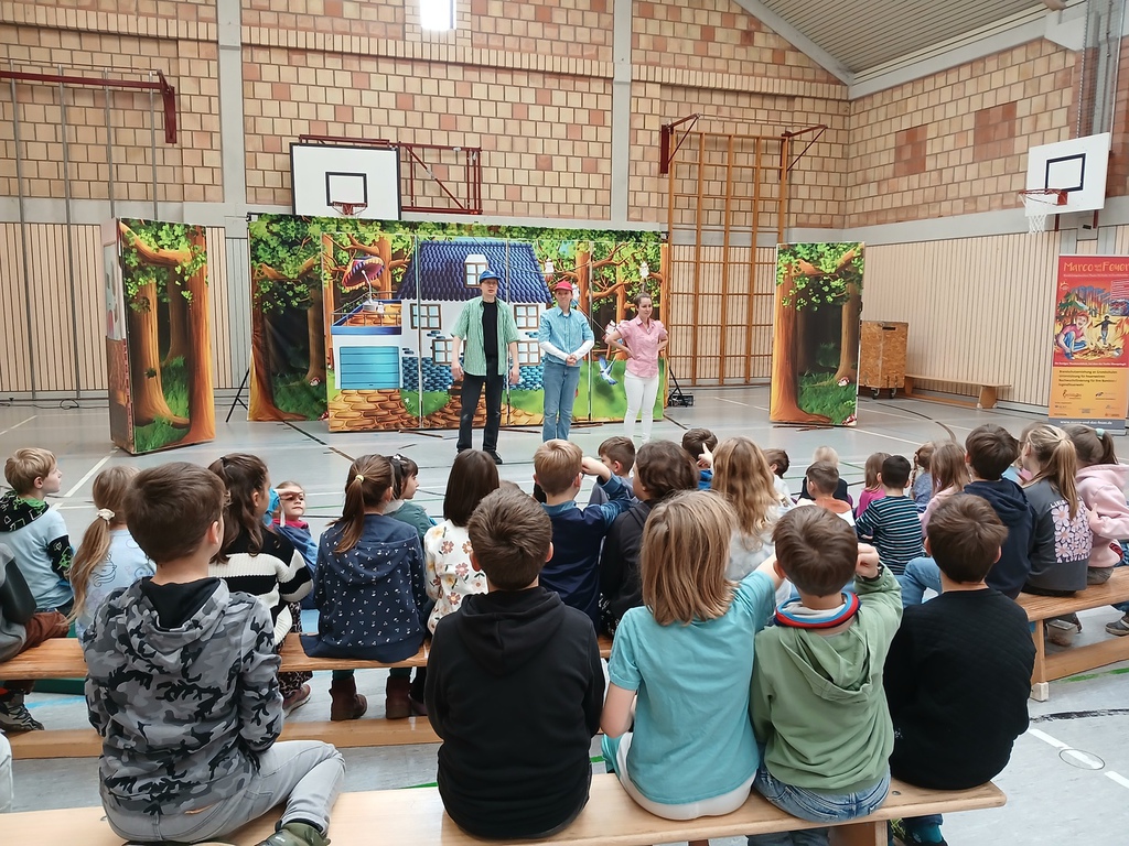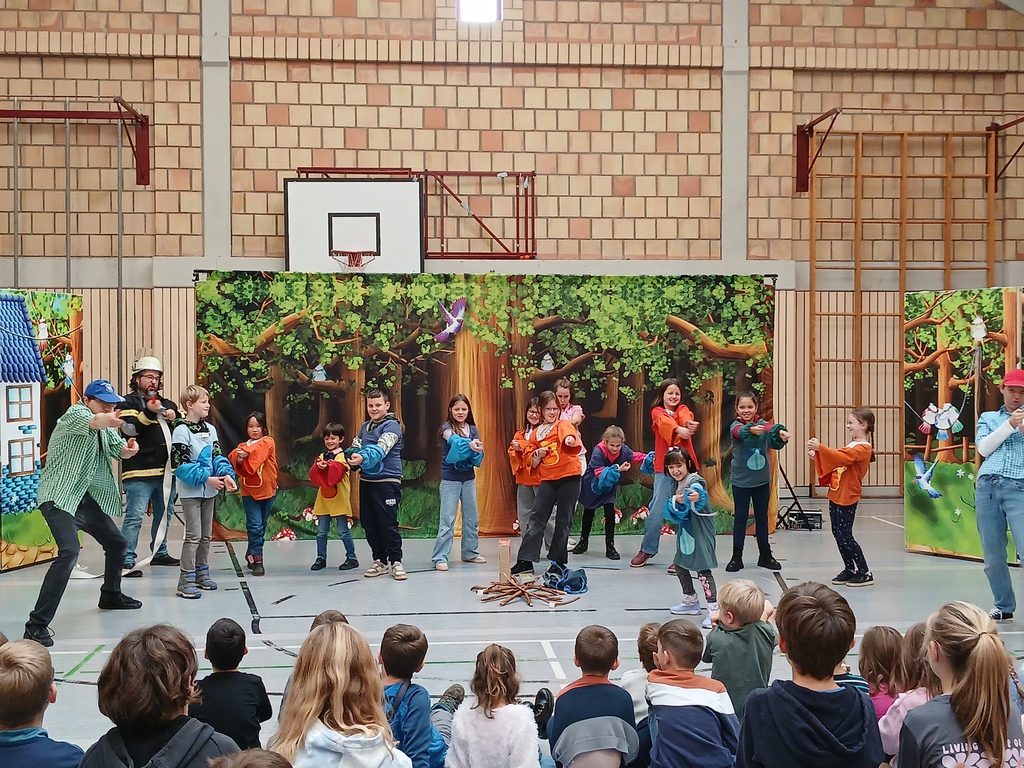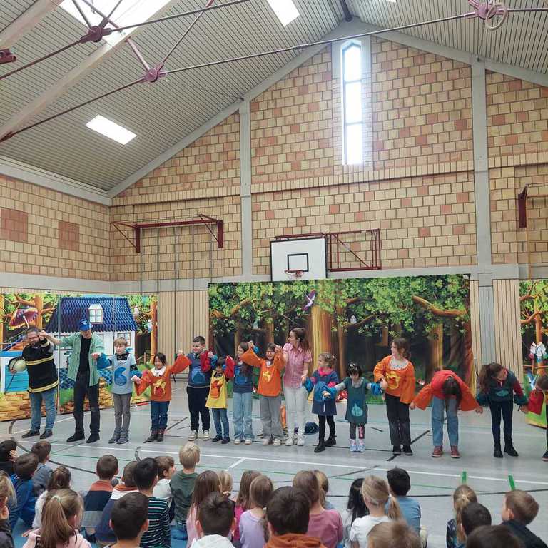 Aufgeregt strömten die Kinder der Grundschule Gusenburg und die „Bärenkinder“ des Kindergartens in die Grenderich-Halle. Denn heute, 29.10.2025, stand kein normaler Unterricht auf dem Stundenplan! Das Mitmach-Theater der TourneeOper e.V. war zu Besuch. Das Ziel dieser Gruppe: wenn Kinder bereits spielerisch lernen, was im Brandfall zu tun ist , können dadurch Menschenleben gerettet werden. Denn die meisten Brände finden im häuslichen Umfeld statt. Deshalb ist es umso wichtiger, bereits bei den Kleinsten Brandschutzerziehung zu betreiben.