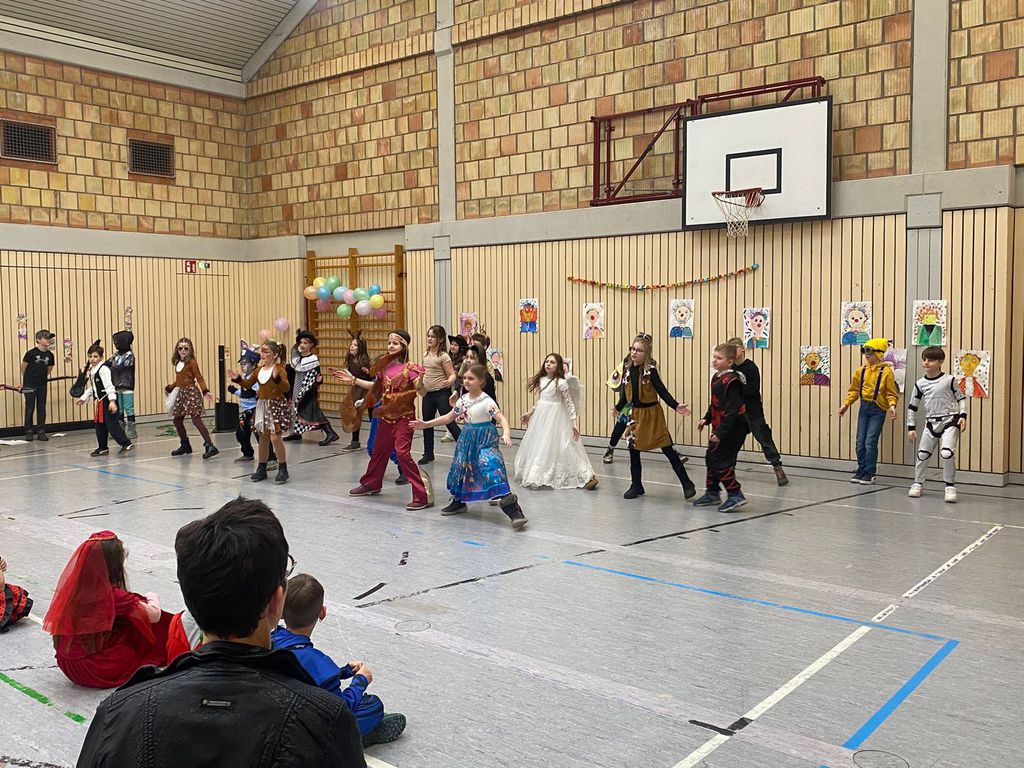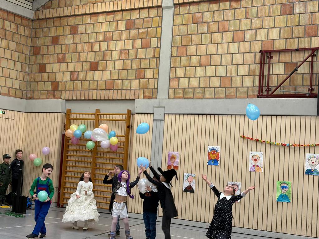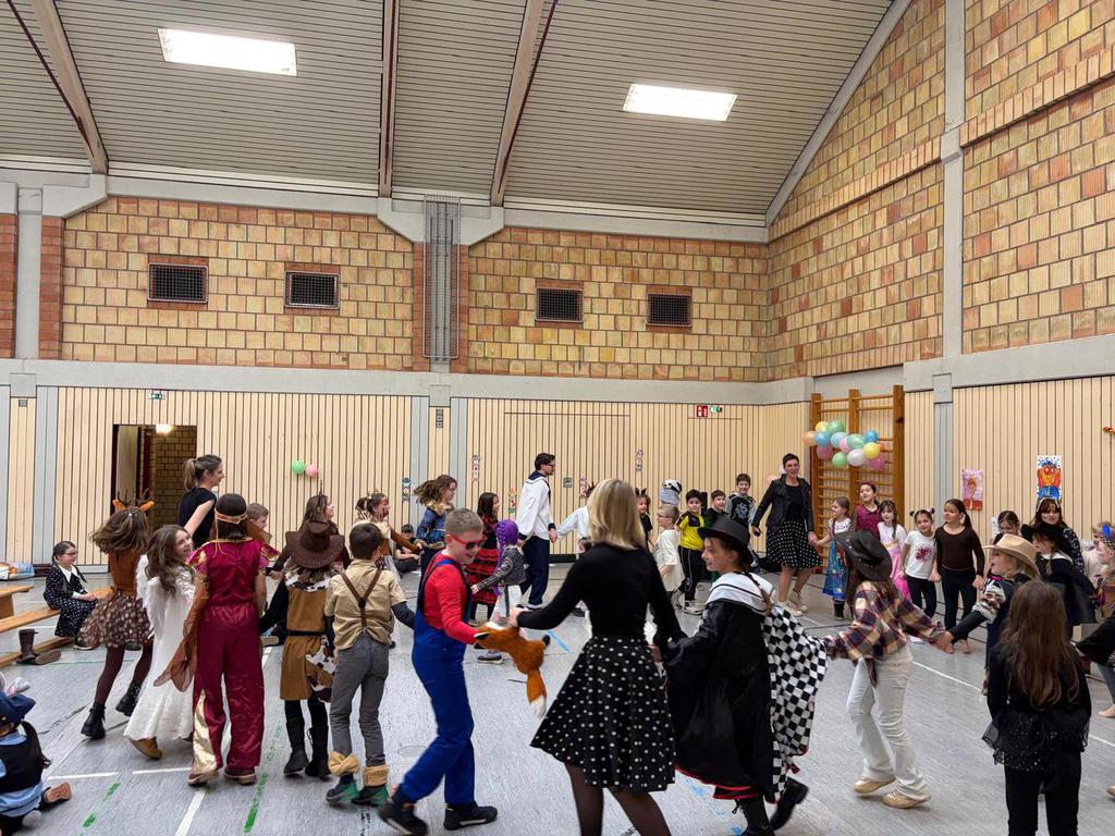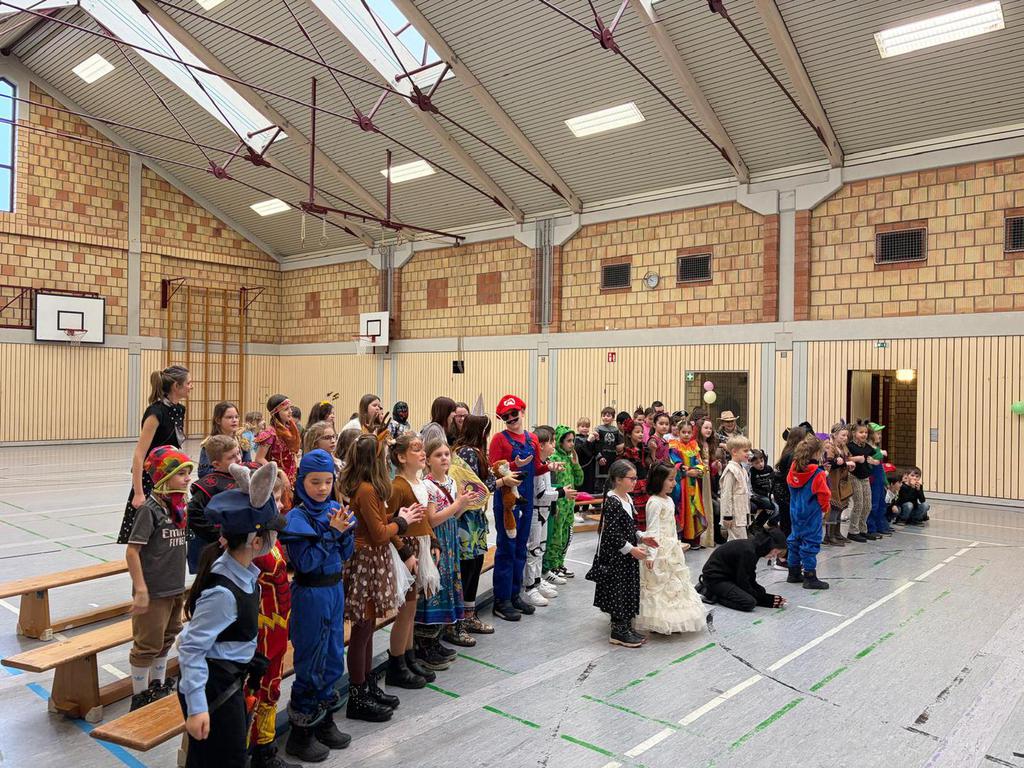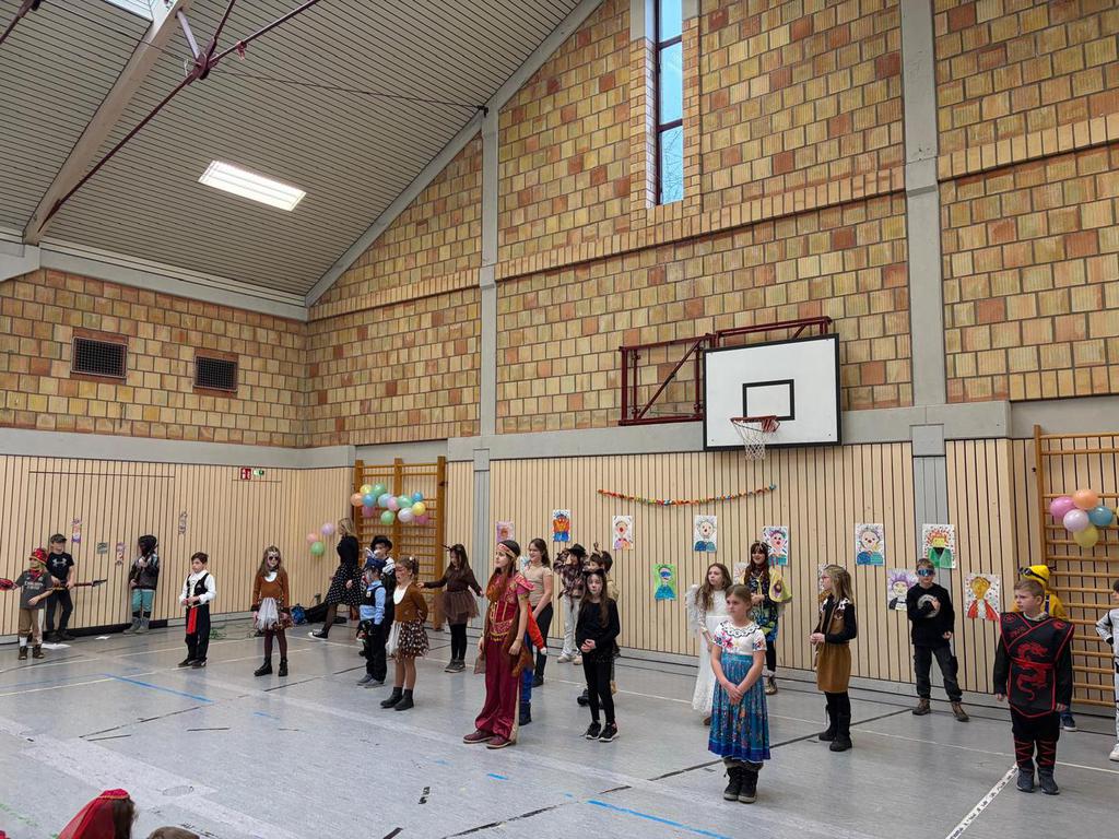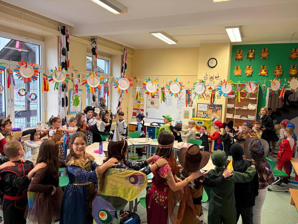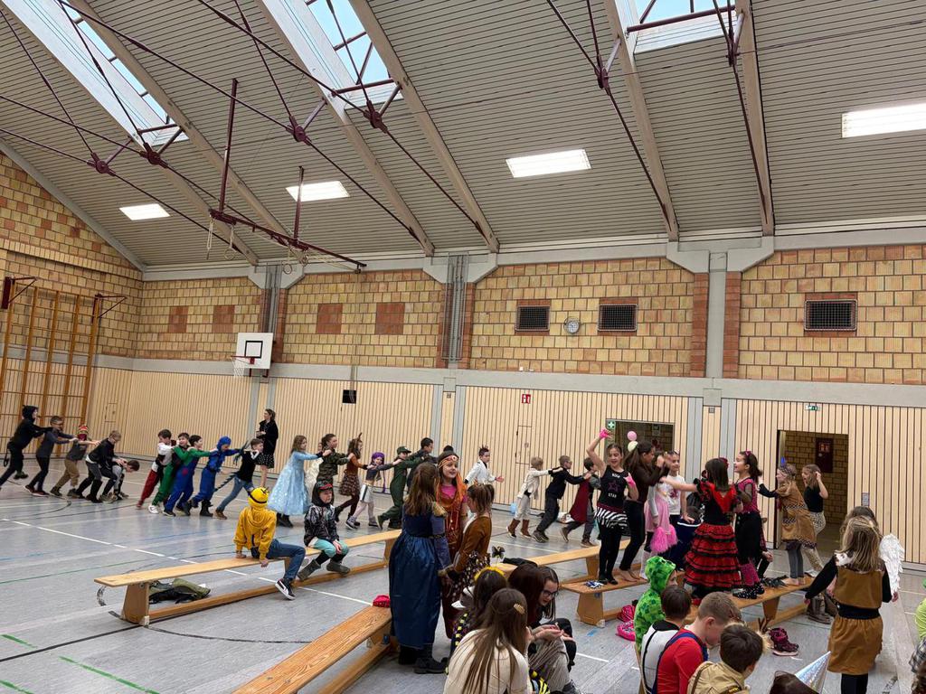 Schlauhause Helau! Laut schallte der Ruf durch die Grenderichhalle - denn am Dicken Donnerstag war es endlich wieder soweit - unsere Faschingsparty startete! Die Kinder und LehrerInnen waren alle toll verkleidet und kamen nach dem bunten Klassenfrühstück gestärkt mit einer langen Polonäse in die Halle.